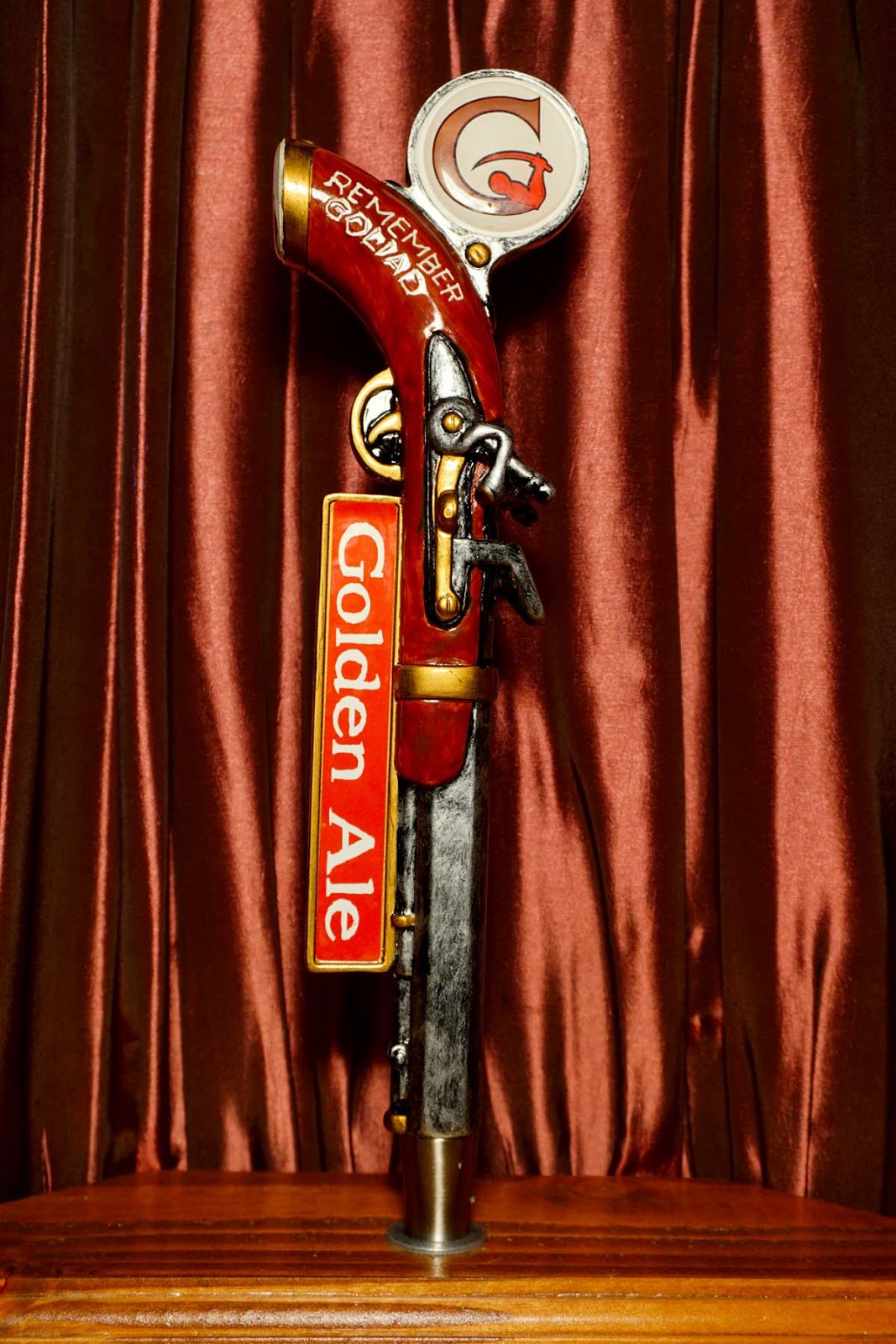 This great looking tap comes to the museum courtesy of reader Manny. It is styled after the flintlock pistols used at the Battle of the Alamo and Battle of Goliad in the 1800s. A decal bearing the phrase "Remember Goliad" appears on each side of the pistol's handle; that phrase was the rallying cry during the war of Texas independence from Santa Ana during the Battle of Jacinto. The decals feature the symbol of a Texan banner, which was unfurled December 20, 1835 at the signing of the declaration of independence of Texas from Santa Anna’s regime. These decals appear on the base of the pistol's handle and also on each side of the handle. Under the barrel on each side of the pistol is a place for a beer variety label. I have both Roustabout Stout and Golden Ale, but I have chosen to profile the Roustabout Stout. It's a very nice tap that hasn't been seen much on the secondary market.