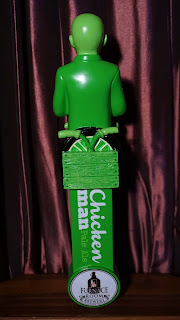 This tap comes to the Museum courtesy of a collectors club member and Mike Glockner, one of the owners of Furnace Room Brewery. It is the first of 4 taps that I will be profiling from the brewery. The Chicken Man tap features a man holding a chicken behind the handlebars and tire of a bicycle, along with the front portion of a crate. On the shaft below is a decal bearing the beer name, while the brewery's name appears at the bottom on a label. On each side of the shaft is another decal featuring a flame, the symbol of the brewery. Except for the label and decals, the rest of the tap is colored in shades of green. Why green? I can't be certain - it may just be an artistic decision - but I will share that information if I get it. The Chicken Man was an actual real person as you will see below, and all of Furnace Room's beers, art and taps are themed off of places or legends in their hometown of Georgetown, Ontario. I've only seen one of these taps appear on the secondary market, so it is currently quite rare, but Furnace Room's production brewery has only been open for a year, so it's possible more of these could pop up in the future.