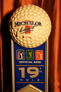 This tap is unusual based on the materials used to make it. Most taps are made of resin, wood or metal, bu this tap is hollow and made of plastic, making it very lightweight. A giant golf ball sits on top of a base that has a decal proclaiming Michelon Light as the official beer of the PGA Tour, the LPGA, and the Seniors Tour, as well as the "19th hole", a common reference to the clubhouse where golfers unwind with a beer after golfing. A Michelob Light decal appears across the front of the golf ball. The front and back of the tap are identical to each other, as are the two sides, so I have reduced the number of photos taken. There is another version of this tap with a black base and a red decal. This tap is easily found on the secondary market and is very affordable.